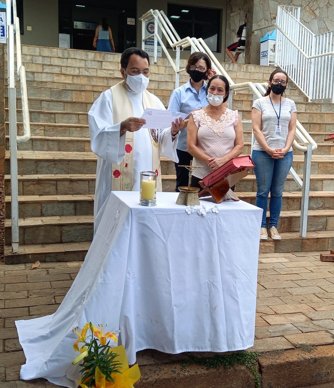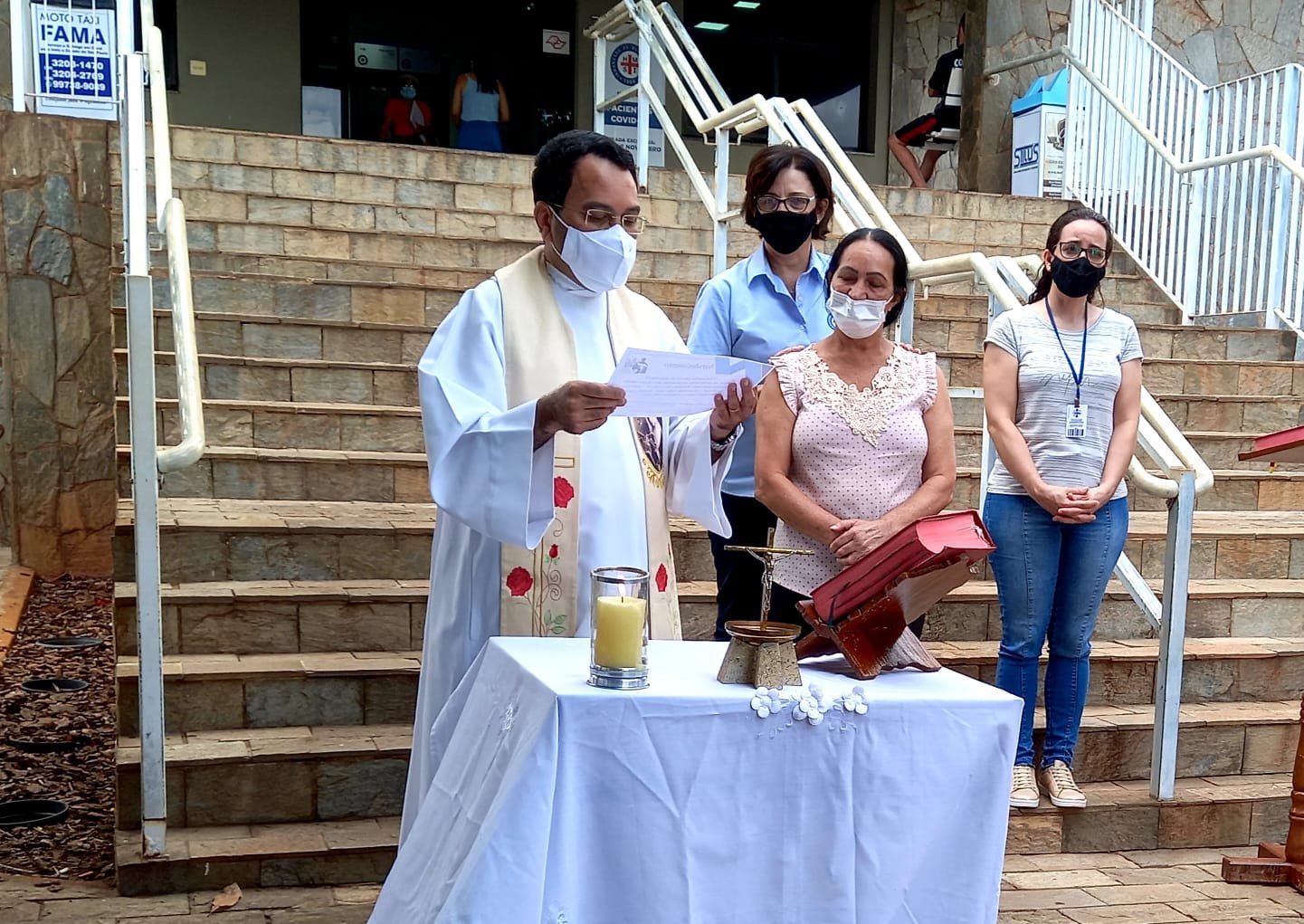 O Padre entregou o certificado de agradecimento da Paróquia de São Benedito “pelo valoroso trabalho realizado neste tempo pandêmico da Covid-19 em 2020 e 2021 ao Hospital e Maternidade Santa Isabel, médicos, equipe de enfermagem e todos os seus funcionários desta casa. “Honra o médico, porque ele é necessário, pois foi o Altíssimo que o criou” – Eclesiastes 38, 1-15. Como parte da celebração, o Certificado foi entregue à colaboradora do time da limpeza do Hospital, Maria Júlia de Oliveira Souza, que representou os colaboradores do HMSI.